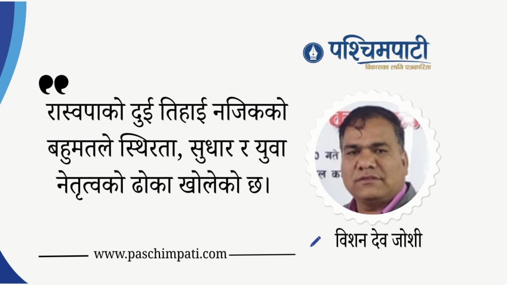 २०८२ को निर्वाचनले नेपाललाई “गठबन्धनको जाल” बाट मुक्त गरेको छ। रास्वपाको दुई तिहाई नजिकको बहुमतले स्थिरता, सुधार र युवा नेतृत्वको ढोका खोलेको छ। तर यो अवसरलाई चुनौतीमा बदल्न नदिन अब बन्ने बालेन शाह नेतृत्वको सरकारले तत्कालै ठोस कदम चाल्नुपर्छ —भ्रष्टाचारविरुद्ध शून्य सहनशीलता, आर्थिक एजेन्डा र समावेशी शासन” प्रमुख गन्तब्य बन्नुपर्छ । यदि सफल भयो भने यो नेपालको दोस्रो जनआन्दोलनपछिको सबैभन्दा ठूलो राजनीतिक परिवर्तन हुनेछ। असफल भयो भने अर्को अस्थिरताको चक्र सुरु हुन सक्छ। इतिहासले अब रास्वपालाई हेर्नेछ —यो युवा ज्वालाले नेपाललाई उज्यालो दिन्छ कि फेरि खरानी बनाउँछ ‘ समयले जवाफ दिनेछ, तर नेपालको राजनितिक घटना कर्ममा कहिल्यै यति ठूलो र सहज अबसर थिएन, अब अवसरलाई परिणाममा बदल्ने दायित्व नयां बन्ने सरकारको हुनेछ।