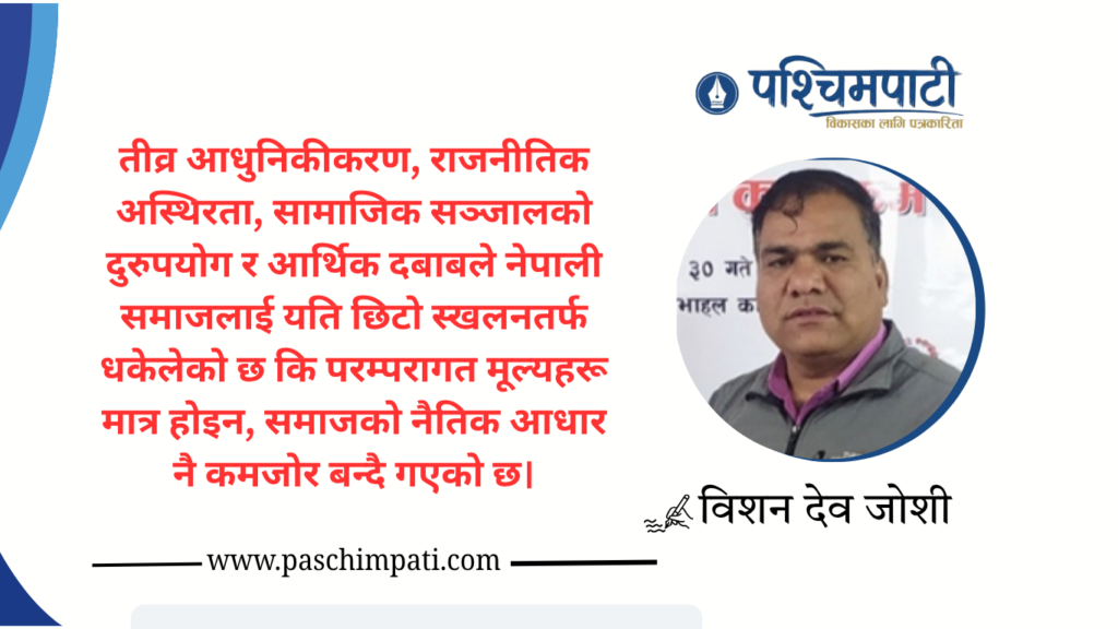 विविधताको बीचमा सहिष्णुता, दुःख-सुख साटासाट गर्ने भातृत्व र एक-अर्काको पीडाप्रति संवेदनशीलताको जगमा उभिएको नेपाली समाज सदियौंदेखि एउटा जीवन्त उदाहरण थियो — हिमाल, पहाड र तराईको भौगोलिक विविधतासँगै जातजाति, भाषा, धर्म र संस्कृतिको बहुलता भए पनि यो समाजले “हामी सबै नेपाली” को भावनालाई सधैं जीवन्त राखेको थियो। गाउँको पिपल चौतारी देखि चोकको चिया पसल सम्ममा छिमेकीको समस्या आफ्नै जस्तो ठानेर छलफल हुन्थ्यो, गाउंघरमा कसैको घरमा शुभकार्य हुंदा होस् वा कुनै आपद-विपद पर्दा होस, बाढीपहिरो वा भूकम्प आउँदा स्वतः सहयोगका हातहरू फैलिन्थ्यो र विवाद भए पनि “भाइ-भाइ” को सम्बन्धले अन्ततः समाधान खोजिन्थ्यो। तर आज यो जग नै हल्लिँदै छ। तीव्र आधुनिकीकरण, राजनीतिक अस्थिरता, सामाजिक सञ्जालको दुरुपयोग र आर्थिक दबाबले नेपाली समाजलाई यति छिटो स्खलनतर्फ धकेलेको छ कि परम्परागत मूल्यहरू मात्र होइन, समाजको नैतिक आधार नै कमजोर बन्दै गएको छ।